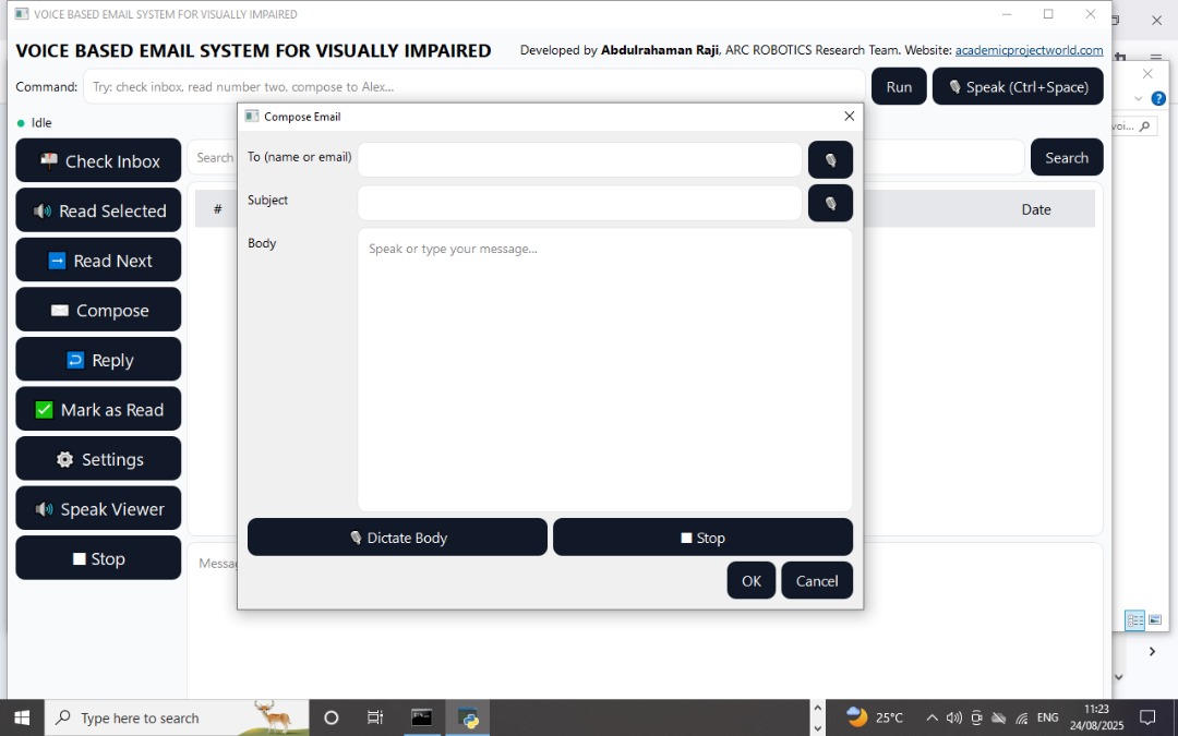 Built with Python, PyQt6, Speech Recognition, and pyttsx3, the system enables users to check inbox, read emails aloud, compose, reply, search, and mark messages as read — all through voice commands.